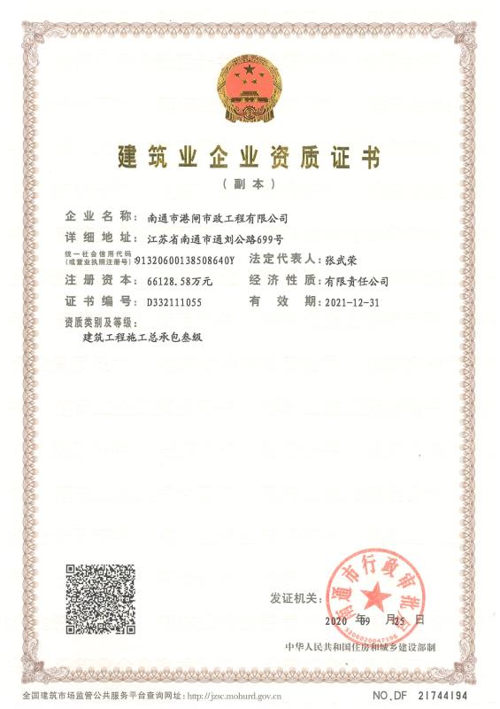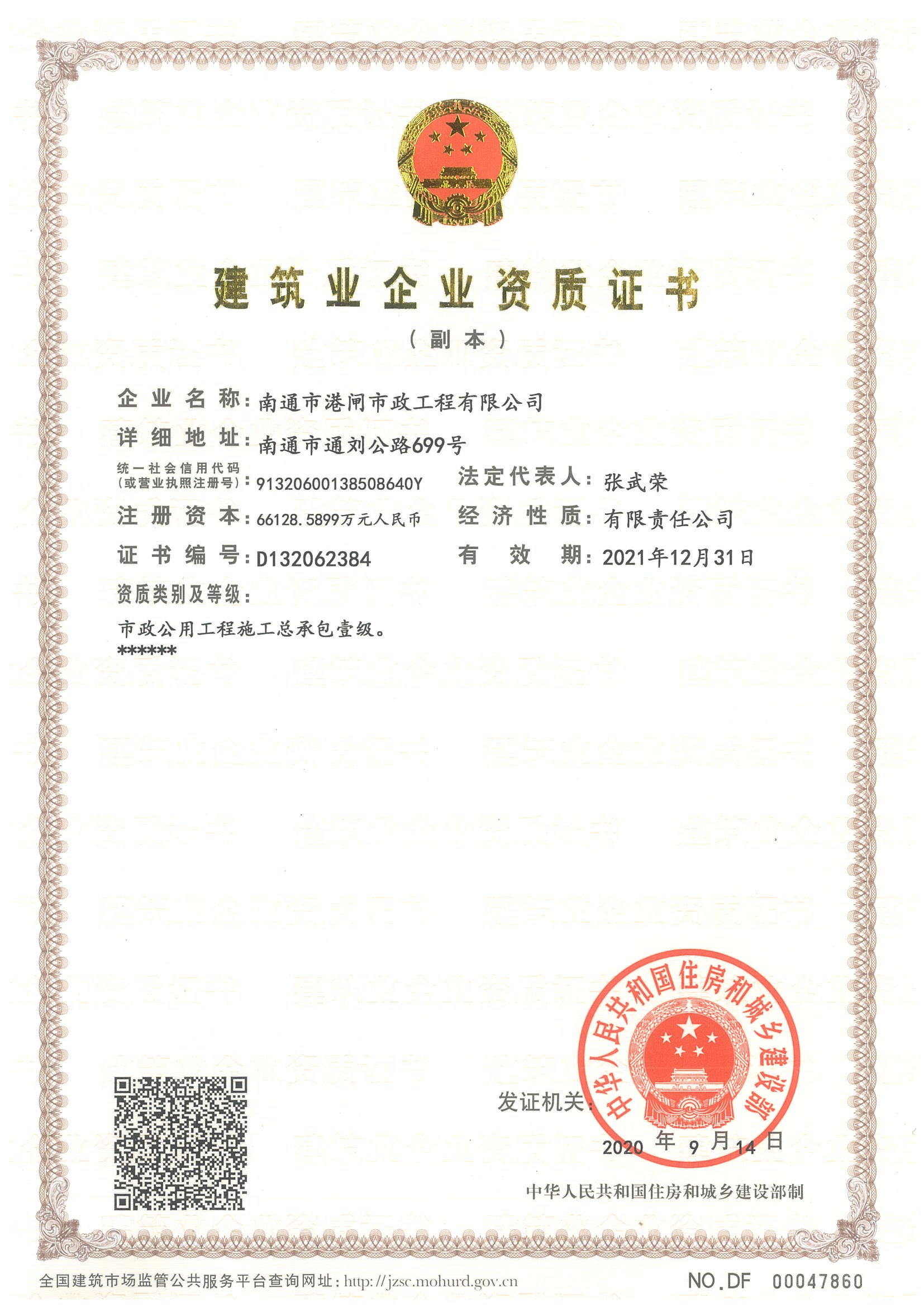 建筑業(yè)企業(yè)資質(zhì)證書(shū)(市政公用工程施工總承包壹級)