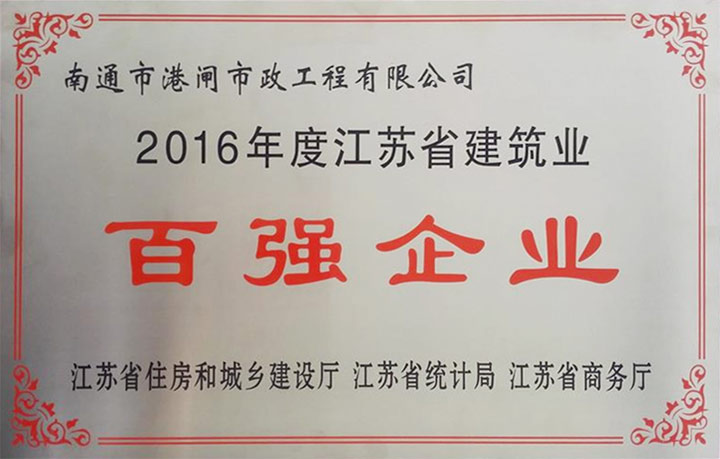 自2014年起,我公司連續三屆被江蘇省住建廳、商務(wù)廳、統計局認定為“江蘇省建筑業(yè)百強企業(yè)”(基礎設施類(lèi))。