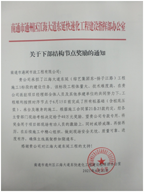 5月24日晚九點(diǎn),隨著(zhù)江海大道東延一標圩亭河橋右幅3#橋臺澆筑結束,標志著(zhù)我公司承建的江海大道東延一標下部結構(樁基礎含樁底壓漿、承臺及墩身)的施工在全線(xiàn)七個(gè)標段中率先完成,比合同約定完成的節點(diǎn)時(shí)間提前了22天。受到工程建設指揮部的表彰和節點(diǎn)獎勵。