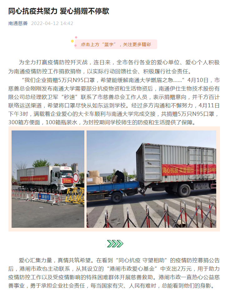 為全力打贏(yíng)疫情防控殲滅戰,在看到南通市慈善總會(huì )“同心抗疫,守望相助”的疫情防控募捐公告后,我公司從設立的“港閘市政愛(ài)心基金”中支出2萬(wàn)元,用于助力疫情防控工作以及受疫情影響的特殊困難群體開(kāi)展慈善救助。